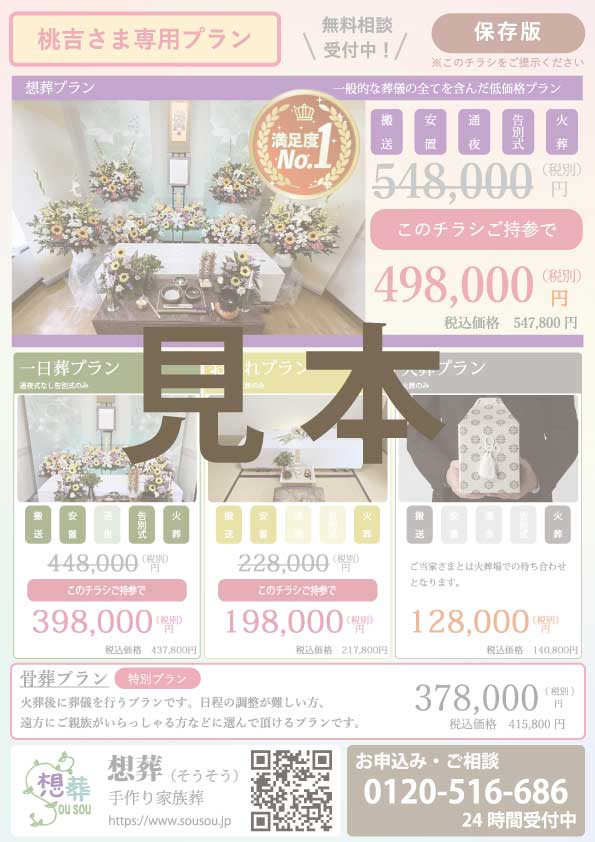 桃吉さま専用プラン 骨葬プラン 火葬後に葬儀を行うプランです。日程の調整が難しい方、遠方にご親族がいらっしゃる方などに選んでいただけるプランです。 プラン料金 : 378,000円 (税込価格 415,800円) 桃吉さま特別割引き事前相談がなくても、桃吉さま専用プランのチラシをご持参いただくことで、5万円(プランによっては3万円)の特別割引が適用されます。 見積り時にチラシをご提示ください。